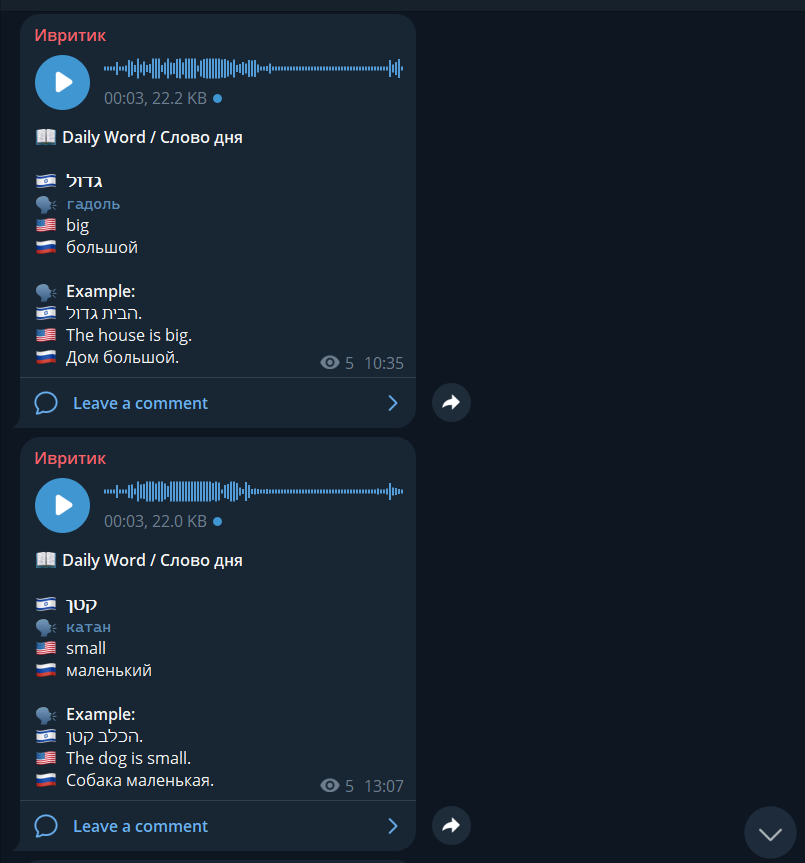 У Ивритик есть официальный Telegram-канал с новыми словами, мини-уроками и полезными выражениями — для ежедневной практики и поддержания результата.